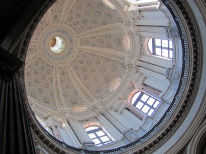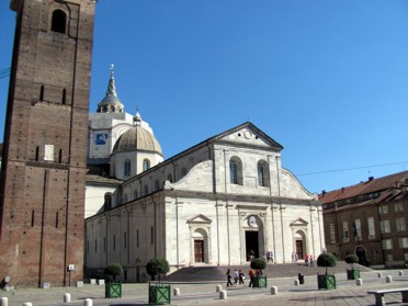 Hier vom Friedhof konnte ich einen Bus nehmen, der direkt zum Castello fuhr. Von dort sind es nur zwei Schritte zum Palazzo Reale. Von aussen gibt es sich recht schlicht. Doch trotzdem hat die große Fassade und der Platz davor mit dem Eingangsportal doch irgendwas. Um das Innenleben zu sehen muss man Eintritt zahlen. Irgendwas um 7 oder 8 Euro. Da hatte ich jetzt aber nicht wirklich Bock drauf. So blieb es bei der Besichtigung von außen. Vom Innenhof geht eine kleine Gasse nach links ab, durch die man auf einen anderen großen Platz kommt mit einem massiven Campanile (Glockenturm) und dem absolute unspektakulären Turiner Dom. Das ist nebenbei der Laden wo das berühmte Turiner Grabtuch aufbewahrt wird. Hätte ich das nicht im Reiseführer gelesen mit Beschreibung wo dieser Dom zu finden ist, ich wäre dran vorbeigelaufen, so unscheinbar sieht das Gebäude aus.