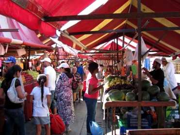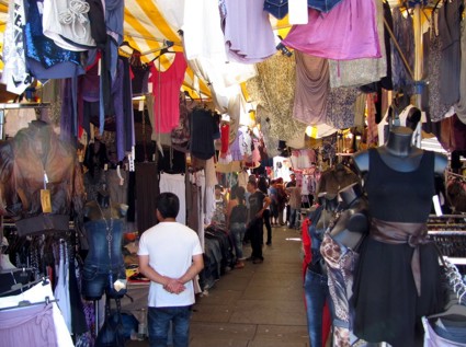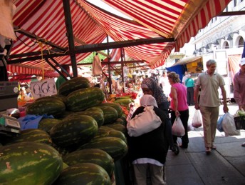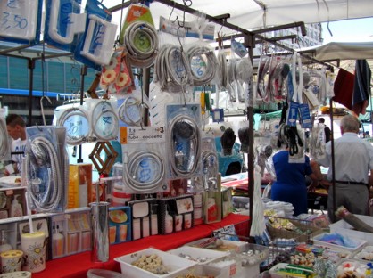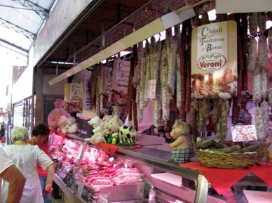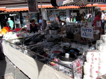 Natürlich bin ich mal rein und habe mir dieses Grabtuch (bzw. die ausgestellte Kopie) angeschaut. Naja. Es scheiden sich ja die Lager derjenigen die die ganze Story die da dranhängt glauben und die die es nicht tun. Ich bin ein wenig unschlüssig, wo ich mich zuzählen soll. Ja nu. Hier vom Platz vor dem Dom bis zum Piazza della Repubblica sind es nur wenige Schritte. Auf der Karte sah das viel weiter aus. Ich war überrascht, das man so schnell da war. Auf dieser Piazza findet Samstäglich einer der größten Märkte Italiens statt. Ein fast unüberschaulich ineinandergehendes Gewühl aus Obst- und Gemüsemarkt, Bauernmarkt, Krimskrams, Klamotten, Fleisch und Wurst und und und empfängt einen hier. Und hier war auch richtig Betrieb. Immerhin war es jetzt schon guter Nachmittag aber trotzdem war hier noch die Hölle los. Irgendwann, bei den Ständen wo man vom Handtuch über die Bratpfanne, Sicherungen, Kabel, Duschbrausen, Uhren bis zu den Nudeln und der italienischen Salami alles kriegen konnte, war ich doch total verzückt von diesem tollen Markt.