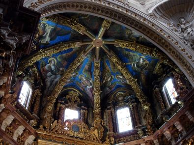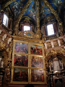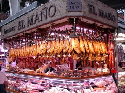 Von hier aus geht es fast schnurstracks durch die Gassen wieder in Richtung der Kathedrale. In dieser Ecke gibt es auch recht viele Bars und Restaurants, wie wir so im Vorbeigehen sehen konnten. An der Kathedrale angekommen war dort nicht viel Betrieb, so das wir rein sind. Für schlanke 3 Euro gibts dann einen Audio-Guide, der auch auf Deutsch einstellbar ist, und man kann bei selbstgewählter Geschwindigkeit durch die Kirche gehen und sich die Erklärungen der einzelnen Stellen per Guide auf Ohr holen. Auffälligster Teil und Mittelpunkt der Kirche ist der gewaltige Altar mit riesigem goldenen Altarschrank. Alles sehr prunkvoll ausgestattet. Geht an in der Reihenfolge der geplanten Stopps kommt man zu guter letzt dann in eine kleine Seitenkapelle, wo dann auch der heilige Gral hinter Panzerglas ausgestellt ist. Wie sagte schon Indiana Jones : Es ist der Becher eines Zimmermannes :-) In der Kathedrale kann man auch den Turm besteigen. Kostet nochmal extra. Hat man die extrem kleinen und steilen Stufen erklommen, hat man von oben eine schöne Rundumsicht über die Umgebung. Eine kleine Rast später gings dann weiter zum Markt. Heute hatte er noch auf. Drinnen gibt es ziemlich viel wuselige Atmosphäre von einkaufenden und schwadronierenden Spaniern zu erleben. Auch die Einkaufsstände selbst waren teilweise seh interessant. Fleischtheken mit ganzen Schweineköpfen drin, Schinkenstände die vor lauter aufgestapelter Schinken fast zusammenbrechen und sonst alles an Lebensmitteln was man sich denken kann. Ich fands toll. Muss man mal durchgelaufen sein. Ich hatte auch den Eindruck, das es nicht wirklich teuer war.