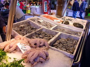 Irgendwann haben wir uns wieder zurück zum Canal orientiert und sind etwas oberhalb der Rialtobrücke beim Mercato. Ein großer Wochenmarkt mit ziemlich viel Fischzeug und großer Obst und Gemüsebereich. Immer wieder nett über einen Markt zu schlendern und zu schauen, was da so angeboten wird. Es gab auch viele Nüsse und Kastanien. Beim Gemüse stand oft explizit dabei, das es Sant Erasmo-Gemüse sei. Das scheit recht beliebt und auch teuer zu sein. Einen Platz weiter haben wir uns an einer kleinen Bar noch einen Spritz gegönnt. Also mein Fall wars nicht. Ein Spritz ist ein Mix aus ein wenig Weißwein mit Campari und noch Kram. Nix für mich. Aber der Venezianer als solches scheint darauf voll abzufahren. Unglaublich viele Leute waren dort und haben jeder ein paar Häppchen und "una spritz" gekauft. Wir haben den Weg fortgesetzt und sind über die Rialto nochmals am Hintern von Gondolini vorbei Richtung WC. Und siehe da. Der kleine Brötchenladen hatte auf. Natürlich haben wir uns da mal mit einem Glas Wein ( 1 Euro ) durch die Auslagen gefuttert. Vieles war leider nicht ganz eindeutig zu identifizieren. Die hatten teilweise recht komische Zusammenstellungen. Beispiel ? Brötchen mit Zucchini, Nusssoße, Frischkäse, Pistazien, Ruccola, Walnüsse und und und. Wahlweise auch wild miteinander kombiniert.