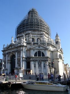 Gut gesättigt und den ein oder anderen Wein später sind wir weiter. Ziel : per Boot nach Accademia und zu Fuß weiter. Die schnurgerade Rio terra Antonio Bragadin führt direkt auf die andere Seite des Stadteils ans Wasser. Da gabs ne tolle Eisdiele, deren Eis ich noch genossen habe. An der Uferpromenade ging es erst mal hoch in Richtung der großen Schiffsanlegestellen. Hier werde die großen Seefähren abgefertigt und so richtig weiter ging es hier auch nicht mehr. So sind wir umgekehrt. An der Brücke "Ponte Lungo" kann man ein Stück den Kanal hoch eine Gondelwerft sehen. Ein wenig sah das Haus und der Platz davor recht chaotisch aus. Es waren aber Menschen dort am Arbeiten und diverse Gondeln am bearbeiten. Weiter die Promenade herunter kommt man an vielen schönen Häusern vorbei und eigentlich hatten wir den Plan bis ganz unten zur Spitz zu gehen und dort herum an der anderen Seite wieder herauf. Ging leider nicht. Kurz vor der Spitz war wegen Bauarbeiten gesperrt. Also ein Stück zurück und einmal quer abgekürzt. Rausgekommen sind wir recht genau bei der riesigen Kirchen Madonna della Salute. Auf der großen Freitreppe davor lies sich ganz gut eine Rast einlegen und das Treiben beobachten. Weiter unten ab der Dogana da Mar, der Meereszollstation, war auch auf dieser Seite der Durchgang gesperrt, so das wir heute nicht mehr zur Spitze gekommen sind.