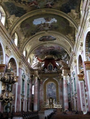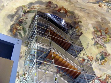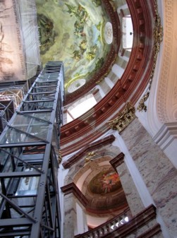 Nach Ende meiner Runde habe ich mich in den Dom rein gerettet. Dort mal alles angeschaut und wieder schweren Herzens raus in den Regen. Ich bin dann durch die kleinen Gässchen der Wollzeile beim Figlmüller vorbei (bekannt für die besten Wiener Schnitzel der Stadt) zur Jesuitenkirche gegangen. Diese eher nicht so sehr frequentierten Kirche ist sehr schön mit den überreichen Marmor und Stuckverzierungen im Kirchenschiff. Von hier bin ich noch ein wenig Richtung Donaukanal gegangen, aber in dem nicht aufhörenden Regen und Sturm schnell keine Lust mehr gehabt. Da ich an der Station Schwedenplatz vorbeigekommen bin habe ich die Gelegenheit genutzt, in den Untergrund zu gehen. Ich bin zum Karlsplatz gefahren und bin dann durch den Park zur Karlskirche gegangen. Die Karlskirche kostet Eintritt, welcher für die laufenden Restaurierungsarbeiten verwendet wird. Dafür darf man mit dem Aufzug bis ganz nach oben in die Kuppel fahren, wo gerade die unglaublich prachtvollen Deckenmalereien restauriert werden.