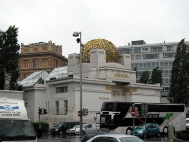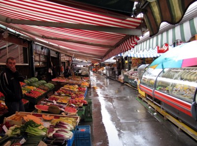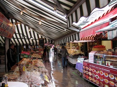 Mitten in die Kirche wurde ein Aufzug gebaut, mit dem die Restaurateure nach oben in die Kuppel reinfahren können. Ist mal für ne Kirche recht interessant. Man kommt rein, geht ins Kirchenschiff und da steht mitten drin dann ein Aufzugsschacht. Auch mal was. Von oben von der Decke kann man zum einen die Deckenmalereien aus der Nähe betrachten und von oben mit tollem Überblick ins Kirchenschiff runterschauen. Wieder raus habe ich mich durch den Park zurück und kreuz und quer durch die angrenzenden Häuser und Straßen zum Naschmarkt begeben. Tja. Viel los war hier ja nicht. Bei dem Wetter wollte hier dann keiner hin. Von dem Naschmarkt als solches hatte ich mir allerdings mehr versprochen. Das ist ja im wesentlichen ein Platz mit ganz vielen Buden und Marktständen. Anhand der Beschreibung im Reiseführer hatte ich jetzt zumindest mit nem Gebäude oder so gerechnet.