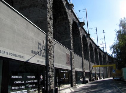Von hier bin ich dann abgezogen und vom nahen Sechseläutenplatz zu meiner letzten Station aufgebrochen. Ich bin mit der Tram zum "Löwenbräu-Areal" gefahren. Laut meinem Reiseführer sollte das alte Brauereigelände mittlerweile umfunktioniert worden sein in ein wuseliges Areal von Kunstgalerien und Museen. Kunst und Kultur also. Ich hab das Gelände dann auch gefunden. Is nämlich nicht schwer, da gibts direkt ne Tramstation vor der Tür. Nur da war nix ! Alles leer und von einem hohen Bauzaun umgeben. Ich bin noch ein wenig an der Seite um das große Gebäude rumgegangen um zu sehen, ob der offizielle Eingang eventuell auf der anderen Seite ist. Das einzige was ich sehen konnte war der hohe Brauereiturm wo noch das Löwenbräulogo dran war. Irgendwas was auf Leben und Galerien hingedeutet hätte, war da aber nicht zu finden. Hmmmm. Irgendwas war hier falsch gelaufen. Entweder war ich falsch oder der Reiseführer hat gelogen oder das ist wirklich alles schon wieder dicht gemacht worden. Dann war das Projekt wohl nicht so ein großer Erfolg. Nahe der Tramstation ging eine hohe Eisenbahnbrücke über die Straße in deren Bögen (also die nach oben halbrunden Bögen zwischen den Pfeilern) man zahlreiche Geschäfte und Restaurants eingebaut hat. Das sah zumindest recht nett aus. Die Läden war scheinbar durchnummeriert und der letzte Laden zur Straße hin hatte Nummer 52. Ich habe mir das jetzt nicht mehr näher angeschaut. Das war aber scheinbar eines der Beispiele dafür, wie man solche Brachen am Bahndamm und an der Bahnbrücke wieder beleben kann. Ich habe mich dann zur Tram begeben und bin zum Hauptbahnhof gefahren und habe mir einen Zug zum Flughafen gesucht. Den erste Zug, der irgendwo im Untergeschoss losfuhr, den hatte ich knapp verpasst. Dem Fahrplan konnte ich entnehmen das ein anderer vom Gleich wasweisich losfuhr. Es waren so um die 10 Minuten Zeit. ich dachte, das schaffst du doch locker. Nur hatte ich nicht damit gerechnet, das dieses Gleis mal gerade das am weitesten weg gebaute Gleis war, was in dem ganzen Bahnhof zu finden war. Immer weiter ging es um noch mehr Ecken und ich war immer noch nicht da. Also eines habe ich gelernt : Der Hauptbahnhof in Zürich ist verdammt groß !