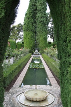 Nach dem Palast kann man dann zum Generalife gehen, was im wesentlichen eine schöne Gartenanlage mit Wasserspielen und schöner Aussicht ist. Ist man hier durch, folgt man dem Weg durch den Wald und schwupps steht man aufm Parkplatz und alles ist vorbei. Wir haben übrigens ca. 3 Stunden in der Alhambra verbracht, was laut einem Infozettel am Eingang auch die estimated time ist, wie lange das dauert. Den Weg zurück in die Stadt sind wir wie schon auf dem Hinweg gegangen und am Plaza Nueva rausgekommen. Von dort ist es nicht weit zur Kathedrale und zum Hotel gewesen. Wir haben noch ein wenig die Füße hochgelegt und ausgeruht und sind bei Einbruch der Dunkelheit wieder los. Da wir aber keine Lust hatten wieder zu Fuß den Berg zu erklimmen, haben wir ab der Kathedrale einen Bus genommen. Und tatsächlich, es gibt auch kleine Busse die durch den Albaicin fahren. Dieser Mirador San Nicolas ist sogar ne offizielle Haltestelle. Die Fahrt ist zwar unglaublich rumpelig und ruppig (die Busse haben bestimmt erst garkeine Stoßdämpfer eingebaut), man wird aber zügig den Berg hinaufbefördert.