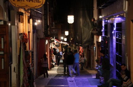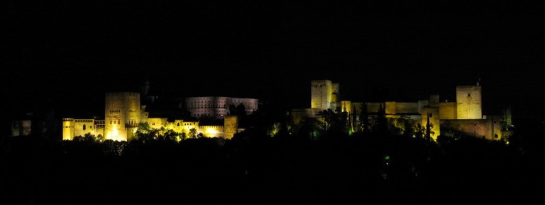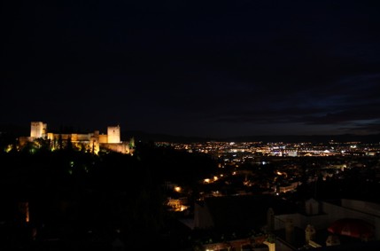 Oben haben wir dann wie erwartet unsere tollen Nachtschüsse machen können. Ist ein recht schöner Anblick so im dunklen. Auch jetzt waren wir bei weitem nicht die Einzigen, die hier waren um Fotos zu machen. Den Weg zurück haben wir dann wieder zu Fuß gemacht. Und obwohl wir unserer Meinung nach genauso gegangen sind wie vorher, sind wir unten ganz woanders rausgekommen. Soviel zum Gassengewirr des Albaicin. Jetzt abends mit den ganzen beleuchteten Lädchen links und rechts war der Basar hier unten auch recht interessant. Es war auch ziemlich viel los. Es wurde an allen Ecken gefeilscht und gehandelt.
