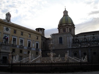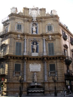 Mein Hotel befand sich im fünften Stock eines Altbaus. Ambasciatori Hotel Palermo. Um in diesem fünften Stock zu gelangen bediente man sich eines betagten alten "Treppenhausfahrstuhles". Sowas hat man schon in vielen alten Filmen gesehen. So ein Ding wo man draußen ein Gitter aufziehen muss und von innen Schließen und innen auch noch ne Innentüre zu macht und dann gemächlich durch das Treppenhaus nach oben tuckert. Inklusive Rundumblick, da alle Seiten der Kabine offen sind. Das war Nostalgie pur. Mittlerweile wars nun schon 15 Uhr und ich habe ganz kurz meinen Kram abgestellt und den Reiseführer rausgekramt und einen Plan gefasst, was jetzt noch auf die Schnelle machbar wäre. Ich bin die Via Roma weiter runter und an der Kreuzung mit der Via Vittorio Emanuele in diese eingebogen. Rund um mich herum tobte die ganze Zeit der Straßenverkehr. Meine Dosis Abgasvergiftung hatte ich für den Tag schon mehrfach intus. Unglaublich. Außerdem ein unglaublicher Krach. Mopeds, Motorräder und Hupen Hupen Hupen. Ab sofort war Palermo für mich ganz klar PaLärmo. Geht man die Emanuele ein Stückchen hoch, kommt man zu den Quatro Canti, den vier Ecken. Diese Kreuzung ist ein zentraler Knotenpunkt in der Stadt und die besagten 4 Ecken dieser Kreuzung sind mit wirklich schönen gewölbten Ecken mit vielen Figuren ( die Stadtheiligen ) verziert. Zwar interessiert das keinen in dem Verkehrsgewühl was hier durchbraust, aber nett isses trotzdem.