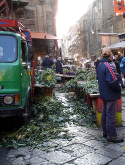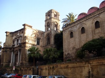 Um von der Hauptstraße wegzukommen bin ich die nächste Möglichkeit wieder links abgebogen und auch prompt an der Piazza Pretoria auf den großen Brunnen Fontana di Piazza Pretoria gestoßen, der vom Rathaus und einer Kirche eingerahmt wird. Dieser große Brunnen ( 130 Meter Umfang mit vielen Figuren von Nymphen und Göttern ) war sozusagen ein Schnäppchen. Eigentlich sollte das Ding zu einer Villa in Florenz. Der fertige Brunnen hat dort aber anscheinend keinem gefallen und da hat Palermo gesagt "Hey wenn ihn keiner will, für nen Vorzugspreis stellen wir uns den wohin". Nun und nun steht der da. Direkt 20 Meter weiter auf dem nächsten Platz, dem Piazza Bellini, trifft man auf die normannische Kirche Ciesa di Santa Caterina. Die hab ich mir dann mal genauer angeschaut. Durch die verschiedenen Kulturen, denen Palermo über die Jahrhunderte ausgesetzt war ( lange Zeit arabisch, dann die Normannen, die Spanier ..... ) gibts auch entsprechend in den Bauweisen der einzelnen Gebäude ziemlich Unterschiede. Diese normannische Kirche wurde über die Dauer immer wieder umgebaut. So gibts den zentralen Bau im byzantinischen Stil, hier noch ein bisschen barocker Schnickschnack und normannische Mosaike. Mit den großen Palmen im kleinen Innenhof sah dieses Ensemble wirklich interessant aus. Von hier aus habe ich mich dann sozusagen querfeldein über die andere Straßenseite ins Viertel Albergheria geschlagen und bin kreuz und quer durch die kleinen Gassen geschlendert. Hier hat sich Palermo dann auch von der sympathischen Seite gezeigt. Kleine steingepflasterte Gassen, auf den Balkonen Sattelitenschüsseln und Wäsche. Leider immer wieder Autos die durch die Gassen fuhren. An manchen Ecken hat auch hier der Zerfall genagt. Irgendwie hatte ich immer den Eindruck, in den kleinen Gassen wo die Häuser links und rechts dicht standen, das ich nen Bauhelm brauche, damit mir nix passiert, wenn mir was auf den Kopf fällt. Ein Stück Dach oder Balkon oder so. Manche der Häuser sahen aus, als würden sie gleiche zusammenfallen. Schließlich bin ich noch über den Markt dieses Stadtteils gekommen. Ein Wochenmarkt, der durch verschiedene Straßenzüge bis nahe zum Bahnhof geht. Der ist da täglich von morgens bis in den Nachmittag. Jetzt so gegen 5 Uhr waren zwar einzelne Händler schon am zusammenpacken, aber es war noch Betrieb. Auf diesem Markt gibts nicht nur Lebensmittel sondern auch alles andere, was man nie haben will. Von A wie Ananas über B wie Bumerang und S wie billige Schuhe bis hin zu T wie Töpfe und Z wie Zwiebeln gibts hier alles. Manches schreit zwar schon nach Kitsch so billig sieht's aus, aber es wird angeboten. Gewöhnungsbedürftig auch die ganzen Hunde, die um die Fleischstände und Fischtische rumwuselten. Jetzt wieder in der Nähe des Bahnhofes angekommen bin ich dort über den Vorplatz dran vorbei und die Via Lincoln durch bis zum botanischen Garten gegangen. Ich wollte ein kleines Abwechslungsprogramm von den Autoabgasen haben. Auf dem Plan war direkt daneben eine "Villa Giulia" eingezeichnet. Dort angekommen habe ich auch gelernt, das im italienischen eine Villa kein Gebäude sondern der Stadtpark ist. Zum botanischen Garten selbst bin ich dann nicht mehr, da diese Villa Giulia schon um 17 Uhr 30 zumachte. Ich bin dort unter den Palmen noch ein wenig sitzen geblieben und dann Punkt 17 Uhr 30 zur Via Lincoln wieder raus.