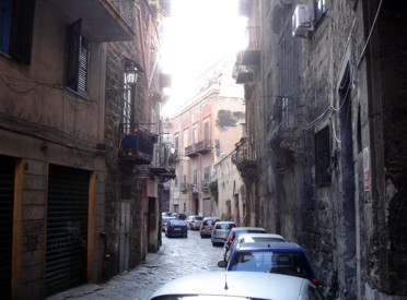 Auch hier findet man sich gut zurecht und schnell steht man vor dem Bahnhof im Busabfertigungsbereich und dort brandet einem auch schon das pralle Leben entgegen. Hat man lebendig das Umfeld des Busbahnhofes überstanden steht man vor der nächsten Hürde, der Überquerung der Straße. Schnell hatte ich gemerkt, das es hier wohl keine Zebrastreifen oder Fußgängerüberwege gibt. Man ist auf sich allein gestellt. Da alle anderen auch todesmutig einfach dort die Straße überquert haben, wo sie gerade wollten, habe ich das dann auch übernommen. Kommen gerade nicht ganz so viele Autos, kann man die Straße betreten und dann erfolgt ein gegenseitiges "Kräftemessen". Denn jetzt kommt es drauf an, wer sein Vorhaben mit mehr Entschlossenheit durchzieht. Geht man einfach todesmutig weiter dann bremsen die Leute sogar ein wenig, um dann, sobald ich das Auto passiert habe wieder voll aufs Gas zu steigen und weiterzubrausen. Irgendwann bekommt man Übung darin und denkt sich auch nix mehr dabei. Später habe ich sogar noch Zebrastreifen gesehen. Da haben die Autos aber auch nicht gestoppt. Mein Hotel lag in der Via Roma. Diese geht geradewegs vom Hauptbahnhof aus von diesem weg und war wirklich kinderleicht zu finden. Ein wenig die Straße runter stand ich auch schon vor meinem Hotel. Die Via Roma ist eine recht breite Schneise durch das Viertel, wovon abgehend links und rechts viele Sträßchen in kleine verwinkelte Gassen abgehen. Bei jedem Blick in solch ein Gässchen habe ich mir immer wieder gedacht, das die Häuser alle irgendwie einen recht maroden Eindruck machten. Abbröckelnde Fassaden, schmutzig, kaputt. Dieses Bild sollte dann eigentlich die ganze Stadt bestimmen, dazu aber später mehr.