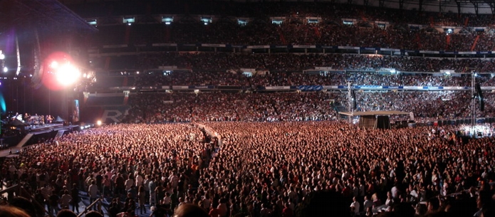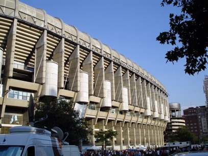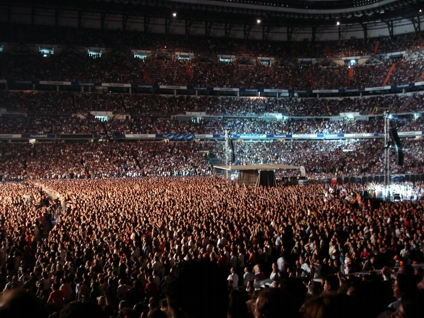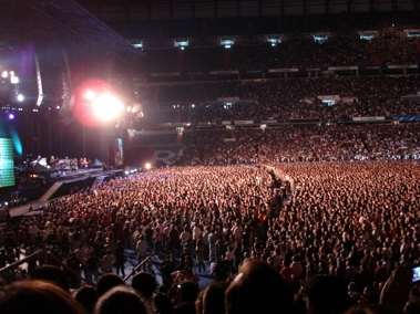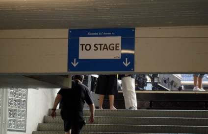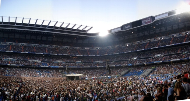 Auf dem Weg zurück bin ich zu einer anderen Bahnstation gegangen. Die direkte Bahnverbindung war nämlich gesperrt wegen Renovierung und ich hätte einmal einen riesigen Umweg fahren müssen. Ein kurzer Fußmarsch hat mich vom Retiro zu einer anderen Station einer anderen Linie gebracht, mit der ich auch ganz easy zurück zum Stadion kommen konnte. Kurz davor bin ich noch an einem riesigen Platz vorbeigekommen, wo zum einen ein riesig hoher Fahnenmast mit Spanienflagge stand, ein irgendwie unförmiges riesiges Steindings-Gebilde und am anderen Ende ein riesiges Kolumbus-Denkmal. Auf der Karte war garnichts besonderes eingezeichnet, deshalb hab ich auch garkeine Ahnung wie die Ecke da hieß. Am Stadion angekommen musste ich natürlich für meinen Eingang mal eben komplett ums Stadion rumlaufen. Arrgh. Dieser Eingang war irgendwie gleichzeitig VIP Bereich, Bühneneingang und Creweingang. Ich hab mich mehrmals versichert hier auch richtig zu sein. Als ich an einem Schild vorbeikam, wo nur groß "TO STAGE" draufstand, dachte ich nur "Ob ich hier richtig bin ...". War ich aber. Mein Platz war sehr nahe seitlich an der Bühne. Trotzdem konnte man gut die Bühne einsehen. Genialer Platz. Hier von ganz unten wirkte das hohe Stadion Santiago Bernabeu noch beeindruckender auf einen. Vor einem gingen 5 Etagen in die Höhe, die später auch vollbesetzt mit Leuten waren. Cool.
