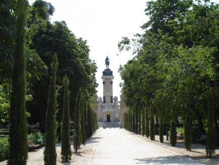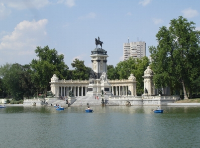 Mein Hotel war nicht weit vom Stadion entfernt, so das ich bei der Station Bernabeu raus bin. 2 mal Rechts eine Fallen lassen und 2 mal geradeaus war das Hotel schnell gefunden. Diesen Fang hatte ich auch über HRS gemacht. Von außen sah das Hotel ziemlich nobel aus, die Lobby geizte auch nicht mit viel Goldprunk. Man konnte aber schon sehen, das die besten Zeiten vorbei waren. Dafür wars billig. Für den restlichen Tag bis zum Konzert am Abend hatte ich eigentlich garkeine Pläne. So habe ich mich dann aufgemacht zum Stadtpark, dem Retiro. Ich bin dann ein wenig im Schatten des Waldes durch den Park spaziert und habe noch ein paar Sachen angeschaut. Später bin ich zum großen See zurück und habe mich in einer der Bars gemütlich unterm Sonnenschirm hingesetzt und bei ein paar Bierchen ein gutes Buch gelesen. So konnte ich es ohne weiteres bis gegen 19 Uhr aushalten. Als ich kurz nach 7 aus dem Park raus zur UBahn gegangen bin, waren es noch 33 Grad.