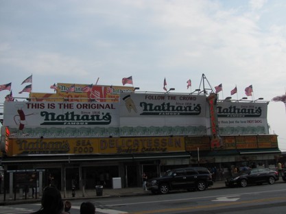 So. Da war ich nun in Newark. Aber war mein Gepäck auch da ? Um es kurz zu machen, ja. Unglaublich. Irgendwann als ich immer hippeliger wurde, ist meine Tasche aufs Band geplumpst und mir gleichzeitig ein riesiger Stein vom Herzen. Konnte meine Tour jetzt doch noch wie geplant zu Ende gehen. Im Gepäckbereich bin ich dann tapfer immer den Schildern zur Bahn gefolgt. Newark hat einen "Skytrain" getauften Zug, der nach Manhattan fährt. Lustigerweise hörten die Schilder dann plötzlich auf und ich hatte absolut keine Idee, wo es zu dieser dämlichen Bahn ging. Dafür standen hier recht viele Schilder mit "Bus nach Manhattan". Mir wars jetzt auch egal. Ich bin raus und dem erstbesten Busmensch in die Arme gelaufen. Fahren Sie nach Manhattan ?. Ja. Wo halten sie ? Public Library/Bryant Park. Absolut Perfekt, ich will mit. So habe ich dann eine Tour über die diversen Freeways und Turnpikes und durch den Tunnel nach Manhattan rein bekommen und bin dann bi der Bücherei ausgestiegen. Von hier waren es nur 3 oder 4 Straßen zu meinem Hotel. Dem "Jolly Hotel Madison Towers" 38. Strasse. Das Hotel hatte ich auch über Priceline gebucht. Allerdings hatte ich mich wegen des allgemeinen Preisniveaus in New York für ein "normales" 3 Sterne Haus entschieden. Und das war ein Fehler. Das Zimmer war klein und eine Renovierung wäre von Nöten gewesen. Die Klimaanlage konnte man eigentlich nicht einschalten weil man sonst einen Gehörschaden bekommen hätte. Der Lärm irgendwelcher Aggregate vom Nachbardach wurde durch die billigen Dünnglasfenster in keinster Weise abgehalten, was eine schlaflose Nacht zur Folge hatte. Der Wunsch nach einem anderen Zimmer konnte erst am nächsten Tag erfüllt werden, das Zimmer war auch nicht ruhiger. Der Lärm drang auch hier rein. Also meine Bewertung : Finger weg von diesem Hotel. Aber jetzt mal genug übers Hotel geärgert, nun mal zu den interessanten Dingen in New York. Ich brauche ja nicht zu erwähnen das auch hier in New York fantastisches Wetter war. Aus diesem Grund habe ich mich dazu entschlossen nach Coney Island zu fahren. Das habe ich ja bisher nur bei Regen und Nebel gesehen. Die Fahrt mit der Bahn zog sich. Irgendwann angekommen war das erste wo mein Blick drauf viel, das Nathans. Ich musste hier einfach hin und mal zwei Hotdogs auf die Hand mitnehmen. So richtig original mit Sauerkraut. Hmm. Ihre große Anzeigetafel für den Eating Contest hatten sie aber noch nicht aktualisiert. Die hatte noch den Gewinner von 2010 drauf.
