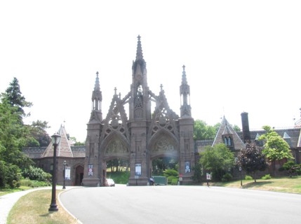 Irgendwann später bin ich wieder auf kartografiertes Areal gekommen. Das wo ich drauf zulief war wohl die "Musical Pagoda" und kurz darauf kamen auch die in der Karte eingezeichneten Seen. Ich habe mich dann weiter auf den Wegen gehalten und bin weitermarschiert. Eigentlich hatte ich gedacht, ich sei am unteren Ende des Parks einmal auf die andere Seite gegangen, als ich wieder an der Straße stand stelle ich aber fest, das ich eigentlich nur am Rand des Parks nach unten gegangen war und jetzt auf der Ocean Avenue wieder an der Linie Q stand. Dafür war das aber ein wirklich großes Stück zu gehen gewesen. Der Park ist wirklich riesig. Wie gesagt, der Park ist natürlicher wie der Central Park. Teilweise etwas verwildert. An manchen Stelen würde ich Abends wohl eher nicht hergehen. Es gibt auch riesige Wiesen zum wasweissich-machen. Tendenziell kam es mir so vor, als ob man doch eher allein ist hier. Habe nicht so sehr viele Leute gesehen. Ich war jetzt hier an der Q Linie. Für mein nächstes Ziel, den Green-Wood Cemetery, musste ich aber entweder eine M oder R kriegen. Also war wieder ein wenig UBahn-Hopping angesagt. Drei Schritte vor, zwei zurück, zwei link und dann wieder rechts auf dem Schnittmusterbogen. Die Station 25th Street der R ist nahe des Haupteingangs vom Friedhof. Eigentlich gehts vom Ausgang Bahnstation schnurstracks den Berg hoch und schon sieht man das imposante Einfahrtstor.
