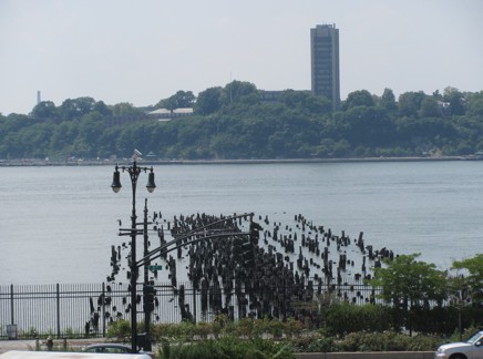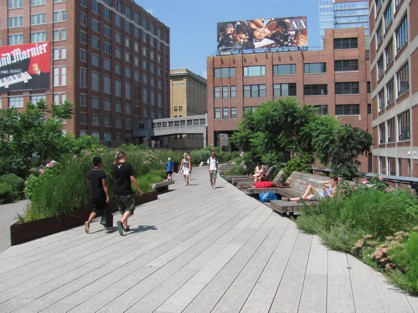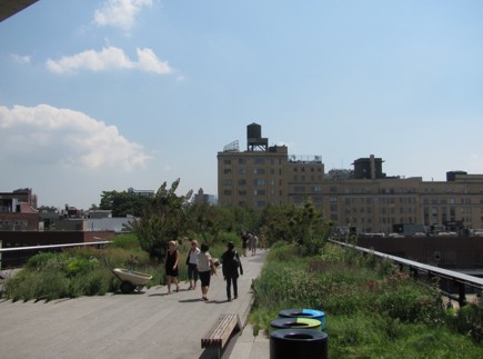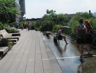 Die Highline ist eigentlich eine alte Hochbahn wo gaaanz früher Frachtzüge hergefahren sind. Diese Hochbahn zieht sich quer durch Chelsea und Meatpacking District. Jetzt hat man angefangen die ersten Streckenteile dieser Hochbahn in einen Park umzuwandeln. Die Gleise würden überbaut, Wege wurden angelegt, Sitzecken eingebaut und alles wurde begrünt. Und so ist sozusagen anstatt einer Hochbahn ein Hochpark entstanden. Ich fand diese Idee ziemlich witzig und deshalb musste ich mir das mal anschauen. Irgendwo der A/C/E entstiegen Ecke 8. Av und 14. Str. geht man die 14. in Richtung Fluss und stößt unweigerlich auf die Highline. Oben war auch recht viel los. Viele Leute gingen dort spazieren oder saßen auf den eingebauten Liegestühlen in der Sonne. Ich bin auch mal so von 12. bis 20. Straße den bisher fertig gestellten Teil abgegangen. Also ich fands wirklich sehr nett. Coole Idee, konsequent durchgesetzt. Weitere Entwicklung ist übrigens bis hoch zur 34 Straße geplant.