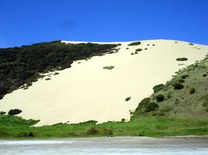 Im Reiseführer war als Tip für die Umgebung von Kaitaia ein Laden mit Vermietung von Quad Bikes angegeben. Der Clou hierbei. Die Dinger wurden so vermietet ohne Guide. Man konnte also frei fahren ohne eine feste Tour zu machen und ohne Begleitung. Das war das Richtige für uns. Also sind wir am Morgen (am späten Morgen) nach einem netten Frühstück nach Ahipara gefahren um diesen Laden zu suchen. Aus irgendeinem Grund machten die aber erst um 11 Uhr auf. So sind wir noch ein wenig mit dem Auto die Bucht entlang durch die Gegend gekurvt. Wir sind schließlich außerhalb des Ortes auf einen Weg gekommen, der schnurstracks ins Land hinein irgendwo in die Wallachei führte. Dieser Straße sind wir ne ganze Zeit gefolgt. Alles Gravelroad aber recht gut zu fahren. Irgendwann hörten dann die Schilder auf und irgendwann auch alle Anzeichen von Leben. Nach einer ganzen Zeit hörte dann auch die Straße auf. Unvermittelt um eine Kurve herum war schluss.