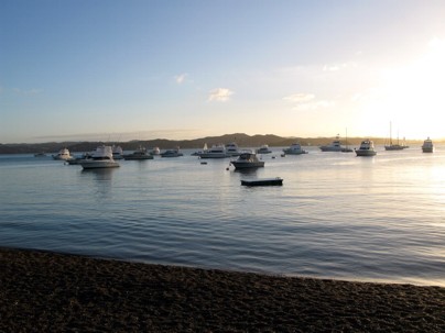 Der Rest des Nachmittags ist dann draufgegangen bei rumjagen auf der Wiese mit dem Hund. Wahlweise wir hinter dem Hund oder der Hund hinter uns oder alle zusammen hinter dem Ball her. Puh. Anstrengend. Als wir uns später fertiggemacht haben für den Abend (als wir dann doch noch irgendwann den Hund losgeworden sind) habe ich festgestellt, das ich mir heute beim Quadfahren ganz gehörig die Beine verbrannt hatte. Aua. Die Lodge liegt oberhalb von Russel auf dem Berg. Auf der Straße wäre der Weg in den Ort sehr weit gewesen. Zum Glück gabs eine Abkürzung in Form eines Serpentinen-Fußweges. Über den war man in 5 Minuten im Ort. Wir sind ein wenig rumgeschlendert und haben uns mal die Mainstreet und die Uferpromenade angesehen. Alle Restaurants hier waren doch ein klein wenig teuer. Außerdem auch irgendwie ein wenig zu vornehm für uns. Als Abendessen haben wir deshalb eine Pizza vom Pizza-Take-Away genommen und diese in der untergehenden Sonne auf einer Bank am Ufer verspeist. Die Pizza war sehr gut und das Abwehren der gierigen Möwen und Enten war kein Problem gewesen.