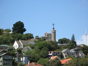 Um uns die weitere Umgebung mal anzusehen und den Wagen zu nutzen sind wir von hier zur Banks Peninsula gefahren. Von der Strasse 75 sind wir bei erster Gelegenheit runter und haben die sog. Summit Road genutzt, die ganz klein, kurvig und teilweise nicht geteert die Halbinsel erschließt. Erste Station haben wir in Lyttleton gemacht. Eigentlich wollten wir uns nur diesen Time-Ball - Turm ansehen. Dieser Turm wurde in früheren Jahren genutzt, um den Schiffen im Hafen die Zeit zu geben. Auf der Spitze des Turmes ist eine große Kugel auf einem Mast angebracht. Um 12 Uhr wurde diese Kugel dann fallen gelassen. Wenn die Kugel dann runtergefallen war, wussten die Schiffe das es 12 Uhr ist. Hört sich jetzt eventuell blöd an, aber das ist in Kurzversion wirklich die Geschichte dieses Turms. Der war aber nebenbei gerade wegen Renovierung geschlossen. So sind wir im Ort einmal die Hauptstraße rauf und runter. Erwähnenswert ist eventuell noch die große Hafenanlage, die anscheinend hauptsächlich zum Verschiffen von Holz genutzt wird.