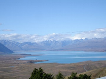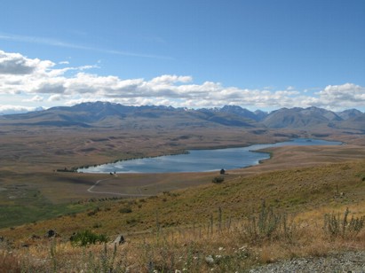 Später zurück am Auto sind wir von hier ohne weitere Stopps dann zum Lake Tekapo gefahren. Naja, vielmehr sind wir automatisch da vorbeigekommen, auf unserem Weg zum Mount Cook. Beim Hundedenkmal für alle Schafhütehunde dieser Welt und der kleinen Church of the Shepherd haben wir gestoppt und uns am See ein wenig die Beine vertreten. Angeblich soll es hier die klarste Luft der ganzen Südhalbkugel geben. Haben wir nicht kontrolliert, man konnte aber wirklich weit schauen :-) Es soll für Fotografen einer besten Punkte zum Knipsen der Alpen sein. Ehrlich gesagt kann ich mich an die Aussicht nicht mehr so ganz erinnern. Man hat die Berge aber wirklich gesehen. Vom See aus liegt hinter dem Lake Tekapo Village ein Abzweig zum Mount John. Dort oben hat man ein kleines Observatorium eingerichtet (Earth & Sky Observatory). Vermutlich wegen der besagten sauberen Luft. Dort kann man hochfahren, was wir auch getan haben. Die Aussicht von dort oben war wirklich klasse. Man kann einen schönen Rundumblick nehmen und wirklich sehr weit sehen. So langsam wurde es aber dann auch Zeit zum Weiterkommen. Ein wenig Strecke hatten wir ja noch vor uns.