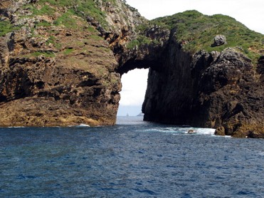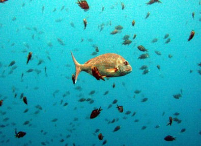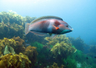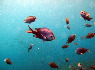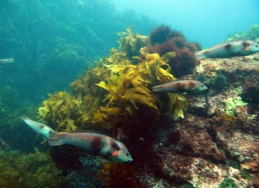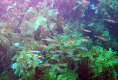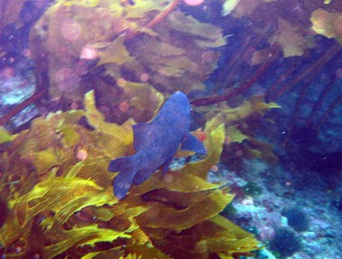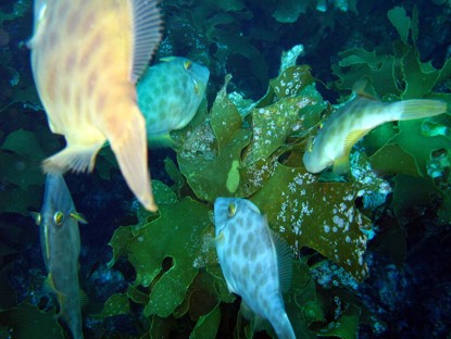 Wir sind von Tutukaka aus ne ganze Zeit übers Meer gedampft. Das Boot, welches für alle Anwesenden groß genug war, hatte ziemlich Dampf, so das wir eigentlich recht schnell bei den ersten Poor Knight Inseln angekommen sind. Reine Fahrzeit war so um eine Stunde. Es sollte an dem Tag zwei Stopps geben. Erster Halt war in einer kleinen Bucht, die aus mehreren einzelnen Inseln gebildet wurde. Da noch jemand anderes den Intro-Dive machen wollte, habe ich mich dazu entschieden meinen beim zweiten Stopp einzulegen. Ich konnte also bei diesem Halt erst mal Schnorcheln gehen. Die schöne ruhige Bucht war ein Paradies zum Schnorcheln. Mit den Tauchanzügen war das auch überhaupt kein Problem. Diese haben nämlich die Eigenschaft ziemlich viel Auftrieb zu erzeugen. Man kommt sich vor wie ein Korken auf dem Wasser. Aber fürs Schnorcheln war das garnicht so schlecht. Man konnte einfach träge auf dem Wasser treiben und dem Getümmel unter Wasser zuschauen. Die ganze Gegend wimmelte von großen Fischen in allen möglichen Farben. Die Vegetation unter Wasser war überraschend grün mit sehr viel großen Seetang, der gemächlich von der Strömung in Bewegung gehalten wurde.