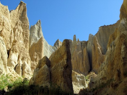 Also haben wir 2x Tandem gebucht und sind erst mal wieder gefahren um die Wartezeit zu überbrücken. Wir sollten in ner guten Stunde wiederkommen. Wir sind dann einfach mal in eine Richtung gefahren und haben mal geschaut, was es so gibt. Irgendwann stand da dann ein Schild zu den "Clay Cliffs". Da sich das ganz interessant anhörte, sind wir dahin abgebogen. Diese Clay Cliffs liegen im Hinterland in Sichtweite eines Flusses und bestehen im Wesentlichen aus Lehm (was der Name ja eigentlich schon hinreichend andeutet). Dadurch das dieser, mit Steinen durchsetzte, Lehm so schön durch Wind und Wetter geformt werden kann, haben sich mit der Zeit ziemlich tolle Formationen gebildet. Also ich fand das ganz nett.