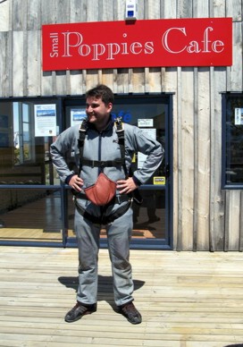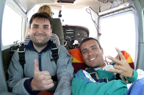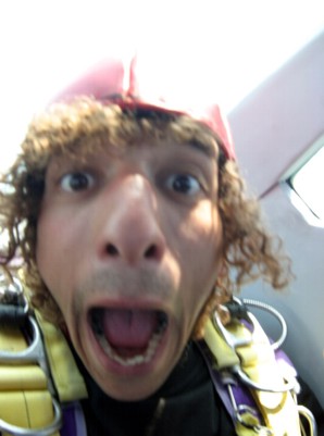 Später sind wir dann pünktlich zurück zum Skydive gefahren und haben nach Ausfüllen der üblichen Ich-verzichte-auf-jegliche-Ansprüche - Formulare dann den Tandemsprung in Angriff genommen. Zuerst war Stephan dran. In der Zeit habe ich mich schön in die Sonne gelegt und gewartet. Heute hatte das Wetter noch ne Schippe draufgelegt und es war jetzt kurze Hosen, T-Shirt, Sandalen und Sonnenbrillen-Wetter. Direkt in der Sonne konnte man es fast garnicht aushalten. Nach Rückkehr der anderen war ich dann dran. Zuerst Einkleiden in super hippe Sprunganzüge und ne tolle Lederkappe (ich sah aus wie .... na lassen wir das) und Einweisung in die grundlegenden Regeln. Während des Fluges auf 12.000 Fuß Höhe (das dauerte so ca. 15 Minuten oder so) waren alle super nett und haben immer gefragt ob alles OK sei. Anscheinend habe ich einen nicht so ganz vertrauenerweckenden Gesichtsausdruck gehabt.