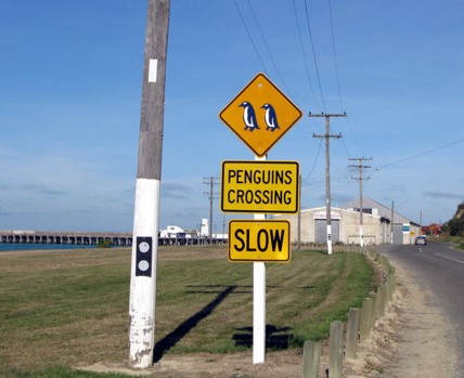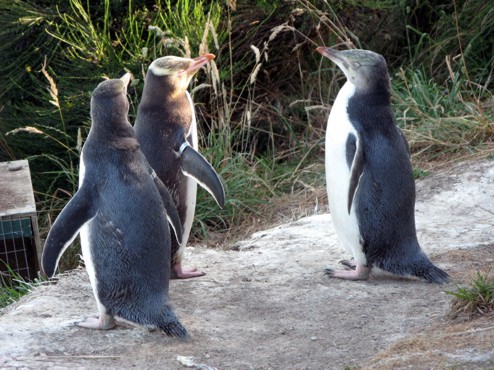 Irgendwann sind wir dann über den Küstenhighway nach Oamaru gekommen. Ein Ort, der für seine Pinguinkolonien bekannt ist. Es gibt hier sowohl kleine blaue Pinguine als auch etwas größere Gelbaugenpinguine. Wir sind einfach mal abgebogen und zur Kolonie gefahren, Dort war aber nicht wirklich was los, was der Tatsache geschuldet war, das die Tiere erst viel später am Abend an Land kommen. Hier war also nix zu holen. Auf dem Rückweg zur Hauptstraße haben wir uns dann verfahren und sind eher zufällig bei der anderen Pinguinkolonie in Bushy Beach rausgekommen. Hier hatten wir Glück. Gerade versammelte ein offiziell aussehender Herr ein Gruppe von Leuten um sich um eine Führung zu den Pinguinen zu machen. Er erklärte alles Mögliche über die Umgebung, den Strand und die Pinguine. Mit ihm gingen wir dann vom Parkplatz durch den Busch ein wenig den Hang hinab. Plötzlich stoppte er die Gruppe und meinte, da ständen ein paar Pinguine direkt auf dem Weg vor uns. Und so war es auch. Drei Pinguine beäugten eine Gruppe von Menschen. Und eine Gruppe von Menschen beäugte drei Pinguine, Das ging ne ganze Zeit so. Dann hatten die Drei keinen Bock mehr und sind abgewatschelt. Cooool.