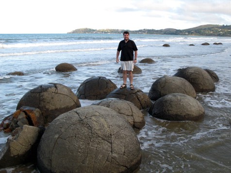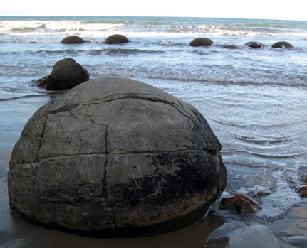 Interessant fand ich vor allem die Tatsache, das die Tiere wirklich da oben am Hang, ca. 20 oder 30 Meter über dem Strand nisten. Wenn man die mal hat wegwatscheln sehen, kann man fast nicht glauben, das das gute Kletterer sein sollen. Zufrieden über unseren Zufallstreffer sind wir dann zurück und haben auch irgendwann die Hauptstrasse wieder gefunden. Auf dem weiteren Weg, der eher ereignislos verlief haben wir noch die Moeraki Boulders "mitgenommen", weil es gerade halt so schon an der Straße liegt. Diese Boulders, also Murmeln, sind an einem Strand verstreut liegende Felsmurmeln. Hört sich jetzt nicht so interessant an, aber einen Abstecher zum anschauen ist es wert. Diese teilweise wirklich kugelrunden Bälle liegen da mitten am Strand und sind auch nicht mal klein. Sie sind auch nicht vulkanisch, sondern irgendwie aus Kristallen oder Mineralien "gewachsen". Ein paar halbe Murmeln kann man auch in den Klippen stecken sehen, Wahrscheinlich purzeln die irgendwann mal auf den Strand wenn die Klippen genug erodiert sind.