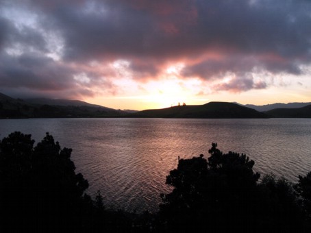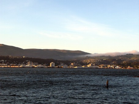 Am Parkplatz oben ist ein Restaurant, welches aber schon geschlossen hatte (es war noch nicht lange nach 18 Uhr). Trotzdem stand da draußen ein Schild rum, was sagte, das dieser Parkplatz und der Zugang zum Strand nur für Restaurantgäste wäre und jeder andere was bezahlen müssen, wenn er zum Strand ginge. Echt dreist. Wenn die Geld von mir hätten haben wollen wär ich sofort wieder gefahren. Dann hätten die sich ihre Boulders von jemand anderen bezahlen lassen sollen. Bevor man dann nach Dunedin kommt, wird das Gelände hügeliger bis bergig. Ein paar Mal geht es ganz schön nach oben um dann endlos wieder in ein Tal zu führen. Je weiter man hochkam, desto nebliger wurde es. Hier stehen auch Schilder, die vor Glatteis warnen! Auf alle Fälle war ist es da oben sehr feucht. Entsprechend üppig grün ist es hier. Irgendwann bei der letzten Talfahrt steht man dann mitten in Dunedin. Wir sind aber einfach nur durchgefahren, weil unser Quartier auf der anderen Seite der Bucht in Portobello lag. Der Weg um die Bucht rum auf die andere Seite zieht sich sehr lang. Das kleine Sträßchen am Wasser entlang erfordert Aufmerksamkeit. Auf der einen Seite direkt am Fels, auf der anderen Seite gehts einen Meter runter ins Wasser und die Straßenbreite war teilweise höchstens 1,5 Spuren. Nach langer Kurverei sind wir dann in Portobello angekommen und die Überraschung des Tages : Unser Bed and Breakfast war ein ganzes Haus für uns alleine. Zwei Schlafzimmer, Küche, großer Aufenthaltsraum, Bad, Waschküche. Super. Und schöner Ausblick vom Balkon über die ganze Bucht. Wir hatten auf alle Fälle unsere Ruhe. Später als wir uns eingerichtet hatten kam noch der Besitzer vorbei um uns nochmals zu begrüßen und um einen Stapel Prospekte zu verteilen, wo alle Freizeitaktivitäten der Insel versammelt waren. Er hat uns noch ein paar Tipps gegeben was man so machen könnte. Die einzige Möglichkeit noch was zu futtern zu kriegen war ein paar Autominuten entfernt in Portobello selbst. Dieses Kaff besteht aus einer Hauptstraße wo die interessanten Läden sind und viel mehr haben wir auch nicht von dem Ort gesehen. Einen Pub gibt's. Der hatte aber schon zu. Um kurz vor 10 waren hier die Bürgersteige schon ein paar Stunden hochgeklappt.