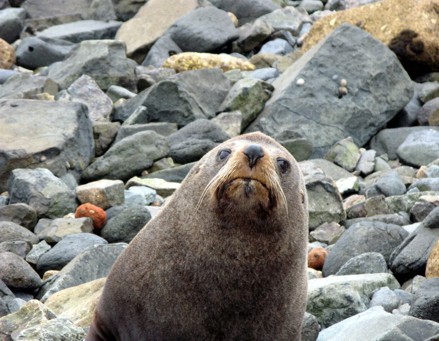 Wir haben sie noch länger beobachtet und sind dann aber auch wieder gefahren. So sehr stören wollten wir die Robben nicht. Zurück Richtung Portobello haben wir bei Monarch-Tours gestoppt. Diese Bootstour fährt von der Nähe von Portobello aus auch bis ganz oben zur Spitze, um die Spitze rum und wieder zurück ein Stück in die Bucht. Die ganze Tour dauert ca. eine Stunde und man hat wirklich eine gute Gelegenheit alle möglichen Robben, Seelöwen, Pinguine und Vögel zu sehen. Jeder auf dem Boot kriegt ein Fernglas und die Leute vom Boot machen immer wieder drauf aufmerksam, wo jetzt genau was tolles zu sehen ist. Auf unserem Weg nach oben zur Spitze sind ein paar Pinguine an uns vorbeigepaddelt und weiter oben Robben und ein recht vorwitziger Seelöwe. Man kann im Fels die ganzen Vögel sehr gut beobachten. Wir hatten das Glück, das auch gerade ein Albatross zur Landung ansetzte. Er war nicht die Grazie in Person, ist aber runter gekommen (wenn auch ein wenig unsaft, Erinnerungen an Bernhard und Bianca und die Albatrossfluglinie werden wach).