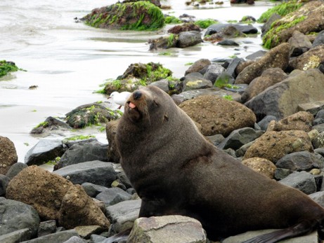 Zum Frühstück haben wir uns heute selbst "bekocht". Also Kaffee und Toast gemacht. Das war alles verfügbar in unserer der Küche. Danach haben wir uns ein wenig die Peninsula angeschaut. Erste Station war "landaufwärts" das Ende der Insel mit der Albatross-Station. Wir sind hingefahren und haben uns den Trubel da oben angeschaut. Da war uns aber doch ein wenig zu viel los. Wir haben uns das Albatrosszentrum mal von innen angeschaut und ein wenig die interessanten Displays durchgeforstet. Aber eine "Albatross-Tour" haben wir nicht gebucht. Stattdessen haben wir uns draußen noch umgesehen und sind nach unten zum Fuß des Felsens gefahren, zum Pilots Beach. Hier sollte eine gute Möglichkeit sein um Robben zu sehen. Zuerst haben wir garnix gesehen, aber als wir dann direkt an den Strand sind und auf den Felsen und Steinen rumgesprungen sind, haben wir gesehen, das wir mitten zwischen ein paar von den Tieren rumstehen!
