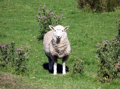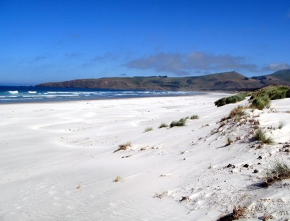 Ich fand, die Tour hat sich gelohnt und wir sind wohlgemutes landeinwärts fast zur anderen Seite der Insel bis zum Parkplatz für den Wanderweg zum Admirals Beach gefahren. Von dort durch schöne grüne Landschaften, an zwei netten Hügelchen aus Basalt vorbei und durch eine Dünenlandschaft zum Strand. Hier sollte es gute Gelegenheit geben um Seelöwen zu sehen. Außerdem sollte da noch sowas wie ein Schiffswrack zu sehen sein. Das hatte uns zumindest gestern der Typ von der Unterkunft erzählt. Wir sind eine ganze Zeit den Strand hinaufgewandert. Irgendwann lag dann vor uns ein großes unförmiges Etwas. Halb mit Sand bedeckt und die andere Hälfte von Trilliarden von Fliegen. Beim Näherkommen konnten wir erkennen, das das ein Tier war. Felsenfest davon überzeugt, das so ein eingebuddeltes und mit Fliegen überhäuftes Ding nur tot sein könnte, bin ich mal hingegangen. Gerade als ich daneben stand und sagen wollte "Hey, der is tot" geriet das Ding in Bewegung, baute sich vor mir auf und stellte sich als ausgewachsener Seelöwe vor.