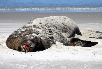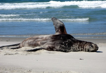 Das ich mich recht schnell verdünnisiert habe versteht sich von selbst. Weiter den Strand hoch lagen dann noch ne ganze Menge anderer Seelöwen, die am rumdösen waren. Mal ne Flosse in die Luft gestreckt und mal einmal im Sand rumgedreht, das wars aber auch schon. Obwohl wir sehr viel Abstand gehalten haben ist einer noch ganz zickig geworden. Wir waren stehen geblieben um ihn genau anzusehen. Er war die ganze Zeit ziemlich grummelig und plötzlich baut er sich auf, grunzt ganz laut und bewegt sich übel schimpfend auf uns zu. Da haben wir auch schnell das Weite gesucht. Das angebliche Schiffswrack stellte sich übrigens als verrostetes Dampferrad irgendwo in den Wellen heraus. Wir hätten es fast garnicht gesehen. Ungefähr da oben sind wir rumgedreht und wieder zurück marschiert. Am Auto angekommen war ich doch ziemlich groggy. Die Wanderung als solches ist aber wirklich schön. Kann man mal machen.