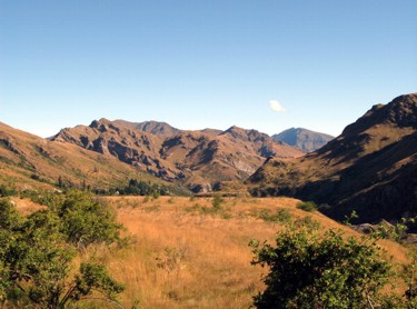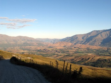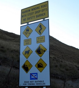 Auf dem Weg nach Wanaka sind wir dann nach Arrowtown in eine Verkehrskontrolle gekommen. Im Ort war gerade ein großes Festival zu Ende (um ca.17 Uhr wohlgemerkt !) und die Polizei hatte die Ausfallstraße in beide Richtungen dicht gemacht und jeden (wirklich jeden !) zum Alkotest gebeten. Die haben einen wirklich smarten Alkotester. Man bekommt das Teil unter die Nase gehalten und muss dann ein paar Worte sagen. Dann zeigt das Gerat an ob man Ärger hat oder nicht. Als uns der Polizist den Alkotester reinreichte wollte Stephan ihn schon nehmen und suchte wo man denn da jetzt reinpusten muss. Der nette Polizist hatte das auch gemerkt und eine kurze Anleitung gegeben. Kurz hinter dem Ort gehts ab zum Coronet Peak, dem Hausberg hier und im Winter Skifahrer-Mekka. Wir sind mal grob in die Richtung gefahren. Mein Herr der Ringe Location Guidebook hat uns dann verraten, das dort in der Nähe die Straße zum sog. Skippers Canyon abgeht und dort auch ein paar Szenen für den Film gedreht wurden. Nun ja. Bei der Einfahrt zur "Skippers Canyon Road" waren gerade mal alle Warnschilder aufgestellt, die es in Neuseeland für sowas gibt. Achtung steil, gefährlich, Flut, Hochwasser, Kühe, Steinschlag, Absturzgefahr etc etc. Außerdem noch ein paar Schilder die darauf aufmerksam machen, das man ab diesem Punkt mit Mietwagen keinen Versicherungsschutz mehr hat.