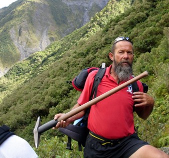 Nach einer kleinen Eingewöhnungszeit ging das gehen auf dem Eis eigentlich ganz gut. Chris hat uns in der Folgezeit dann auch kreuz und quer über den Gletscher gescheucht. Abhänge hinauf, Abhänge hinunter, an tiefen Spalten entlang, an dicken Löchern entlang. Ich hatte ja schon vorher mal nen Gletscher bestiegen, nämlich in Kanada. Aber da war das eher eine riesige und eher ebene Eiskappe, die gemütlich ins Tal floss. Der Fox Gletscher hier sah eher aus, als wenn irgendein Riese das Eis genommen hätte, einmal durch den Quirl gemixt und dann aus großer Höhe einfach wieder ausgekippt hat. Es gab hier ganze Bereiche, die so zerklüftet und zerrissen waren, das man da gar nicht hinkam. Überhaupt gab es keine paar Meter, wo man nicht über einen Vorsprung hinweg, um eine Eisspitze herum oder um einen Abgrund herum gehen musste. Also ich fand es wirklich sehr interessant. Die ganze Tour wurde immer wieder begleitet von Chris' Erläuterungen und Erklärungen über den Gletscher, über Eis allgemein, über das Verhalten der Gletschers und ein paar Anekdoten. Es war echt spaßig.