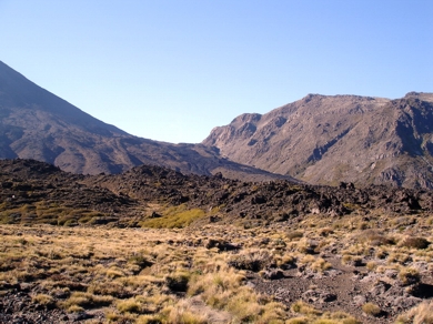 Der Start der Wanderung ist recht stressfrei. Man geht vom Parkplatz aus recht moderat zum Fuß der Berge. Dies ist nicht weiter wild. Das Ambiente ist jedoch ziemlich klasse. Schon hier unten ist alles im Vulkanlook dekoriert. Klippen, geröllige Berghänge, Lavaflüsse und Lavafelder inklusive. Die Landschaft ist sonst komplett vegetationslos. Dann wird es ziemlich schnell sehr stressig. Denn am Fuß der Berge beginnt der Aufstieg auf den Mangatepopo Saddle. Dieser ist sehr steil und hier werden in kurzer Zeit auch die meisten der 750 Höhenmeter des ganzen Weges absolviert. Die Sonne brennt, das Haar sitzt :-) Nach diversen Stopps auf dem Weg oben auf dem Saddle erst mal einen langen Verschnaufer eingelegt. Hier hab ich auch seit langem nochmal die Sonnencreme rausgeholt. Hier oben auf dem Berg kam mir die Sonne nochmal extra intensiv vor. Vom Saddle aus kann man sich entscheiden, ob man als kleinen Seitenabstecher (2km, 600 Meter Aufstieg) auf dem Mount Ngauruhoe steigen möchte. Stephan hat diesen Aufstieg gewagt, wohingegen ich den "normalen" Weg weitergegangen bin.