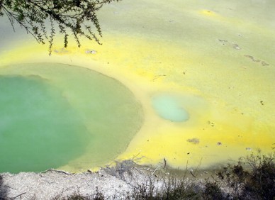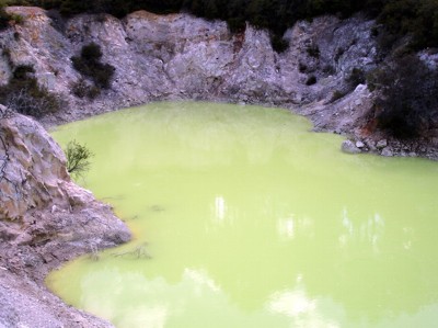 Der nächste Stopp war dann ein wenig weiter dem Highway 5 runter am Wai-O-Tapu Thermal Wonderland. Eine Attraktion gibts hier schon umsonst vor Einfahrt in den Park. Ein größeres Gebiet mit schön blubbernd vor sich hinkochenden Schlammtöpfen. Schon beim Aussteigen aus dem Auto hört man das dauernde schmatzende Blubb Blobb. Irgendwie geht von diesem Schlamm eine große Faszination aus. Man bleibt unwillkürlich länger da stehen um noch nen großen Spritzer oder noch nen großen Blubbser zu sehen. Das "Wonderland" ist im Gegensatz zum Valley doch eher "vulkanisch". Das fängt an mit vielen übel riechenden Dampflöchern, zusammengefallenen Schloten und sehr vielen, in schillernden und giftigen Farben leuchtenden, Wasserstellen. Da ist alles von Rot über Gelb bis leuchtend Grün dabei. Diverse andere Mischfarben sind ebenfalls vertreten. In einem beim Eingang ausgehändigten Parkplan stehen die wichtigsten Informationen über Zusammensetzung der einzelnen Brühen drin. Der Park hat mehrere Rundgänge die man sich je nach Lust und Kondition zusammenbauen kann. Wir sind den großen Rundweg gegangen und ich fand es wirklich ganz gut.