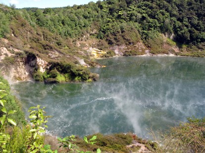 Natürlich haben wir am Morgen das Frühstück bei Colleen gerne mitgenommen. Sie hat sich auch fast überschlagen und hätte uns, wenn wir nicht gebremst hätten, uns mit tausend Sachen überhäuft. Wir haben dann bei ein paar Kaffee noch länger gesessen und uns unterhalten. Zuerst die üblichen Sachen wie woher, wohin, wie lange etc.. und dann über alles mögliche. Ike war nicht da. Er war schon unterwegs. Ich glaube er war Busfahrer. Wir sind dann los und wollten heute die Vulkan-Attraktionen der Gegend abklappern. Im wesentlichen gruppiert sich alles Interessante entlang des Highway 5. Man muss eigentlich nur selbst noch auswählen, wo man jetzt abbiegt und wo nicht. Erster Stopp : Waimangu Volcanic Valley. Dieses ganze Tal ist eine große Vulkanzone und Geothermalzone, wo dampfende Schlote und blubbernde Quellen in rauer Menge nebeneinander liegen. Es gibt hier eher mehr im Bereich Thermal und heiße Quellen. Der "Vulkanteil" mit schwefeligen oder sonstwie übelriechenden Dämpfen ist eher weniger vertreten.