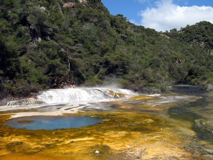 Durch das ganze Tal zieht sich ein schöner Wanderweg, auf dem man an allem Wichtigem vorbeikommt. Beim Start bekommt man ein Faltblatt in die Hand, auf dem alle Stationen des Weges erklärt sind. Das gabs sogar auf Deutsch, wobei allerdings ein paar Übersetzungen ziemlich komisch waren. Spätestens beim Bratpfannen-See hab ich mir doch das englische Original gewünscht. Wie gesagt, es gibt hier eher mehr blubbernde Quellen und kochende Seen, die sich hauptsächlich durch ihre Färbung unterscheiden. Es gibt auch gegen Ende noch große Sinterterrassen. Der Weg durch den Park ist sozusagen Oneway. Am Ende kann man noch ne Bootstour über den angrenzenden See machen oder man setzt sich in den Shuttlebus und fährt zurück zum Ausgangspunkt. Die ganze Tour durch den Park hat sich ziemlich hingezogen. Wir haben uns länger aufgehalten wie gedacht. Aber schön hier, sollte man mal durchwandern.