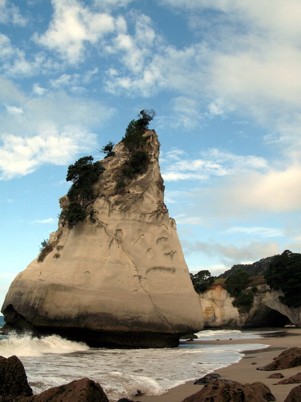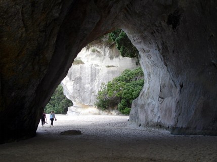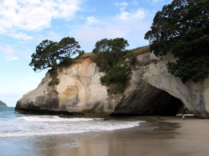 Von der Farm weg Richtung Hot Water Beach kann man auch ein Stück weiter direkt zu Cathedral Cove fahren, bzw. zum Ausgangspunkt der Wanderung dorthin. Wir waren zwar schon ein wenig spät dran und uns kamen die Leute eher entgegen (der Parkplatz leerte sich auch schon zusehends) was uns aber nicht davon abgehalten hat, die Wanderung runter zum Strand zur Cathedral Cove zu machen. Der Pfad geht durch Buschland auf und ab eine lange Schleife runter zum Strand. Am Strand ist dann auch in unmittelbarer Nähe der Durchgang im Fels (die Kathedrale). Hier unten wars richtig nett. Wir hatten zwar nicht vor hier ewig lange zu bleiben und für einen Sprung ins Wasser war es definitiv zu kalt. Wir sind aber noch ein wenig hier rumspaziert. Der Strand wird von beiden Seiten von Felsen eingegrenzt. Auf der einen Seite hätte man zwar über diese Felsen weiterklettern können, aber ich glaube, da kam nix interessantes mehr. Also sind wir einfach ein wenig hiergeblieben und haben uns den Wind um die Ohren blasen lassen und haben Leute beobachtet. Zurück gehts auf dem gleichen Weg. Teilweise sind die Aufstiege ein wenig heftig, aber nach ein paar Bergauf - Abschnitten gehts meist einigermaßen eben zurück zum Parkplatz.