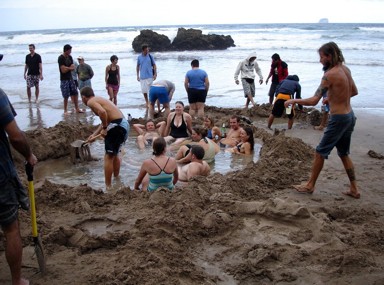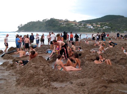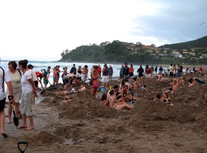 Jetzt mittlerweile fast 20 Uhr haben wir uns dann zum Hot Water Beach begeben. Dieser Strand ist mit ein paar Heißwasserquellen ausgestattet, die aus dem Sand sprudeln, wenn es Ebbe ist. Sonst liegt das alles unter Wasser. Heute war Samstag und wir hatten ein ganz klein wenig gehofft, das der Durchschnittsneuseeländer am Samstag Abend irgendwas anderes tut, als am Hot Water Beach rumzulungern. Weit gefehlt. Der Strand war brechend voll. Die Leute hatten sich Pools ausgehoben und es sich dort im warmen Wasser bequem gemacht. Es wurde Bier und Wein angeliefert und die Leutchen haben sich nen tollen Abend dort gemacht. Wir haben auch noch unser Glück bei ein paar Ausgrabungsarbeiten versucht, aber keinen wirklich vielversprechenden Platz mehr gefunden. Das warme Wasser kommt nur auf sehr begrenztem Gebiet hervor. Und die besten Plätze waren schon von großen Ausschachtungen belegt.