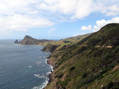 Nach dem kleinen Abstecher zu Fuß auf dem Walkway war es nun auch schon Nachmittag und wir wollten langsam umdrehen. Das erste Stück mussten wir wohl oder übel so zurück wie wir gekommen waren. Irgendwo kurz vor Colville gibt es noch eine kleine Querverbindung zur östlichen Route. Man trifft dann auf die Straße, die nach Port Charles führt. Diesen Weg haben wir genommen und sind so also die Ostroute auf der anderen Seite der Insel zurückgefahren. Alles übrigens noch Gravelroad. Auch hier ist nix geteert. Man kommt hier in wilder Berg- und Talbahn immer wieder an netten Aussichtspunkten vorbei, die weite Ausblicke über die ganze Insel bieten.