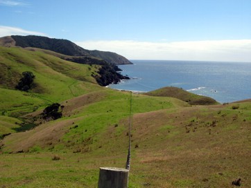 Eigentlich ließ sich die Strecke hier oben doch noch recht gut fahren. Wir hatten schon schlechtere Gravelroads die Wochen zuvor. Irgendwo oben schon fast am Ende der Straße an der Nordspitze angekommen, wurde der Weg ein kleines Stück recht schlecht. Aber immer noch ohne große Probleme befahrbar. Ach so ja. Die Straße hört hier oben dann wirklich auch auf. Es gibt um die Nordspitze rum keine Verbindung mit der anderen Seite der Insel. Einzig ein Wanderweg, der Coromandel Walkway, ist als Verbindung vorhanden. Von diesem Coromandel Walkway sind wir dann auch noch ein kleines Stück gegangen. Der Weg führt vom Ende der Straße hinauf auf die Hügel und über die Viehweiden an der Küste entlang etliche Kilometer (20 oder 30 glaube ich) zum Ende der anderen Straße, die von Osten her hier hochkommt. Da es also eine Art One-Way-Wanderweg ist, sind wir nach einem guten Stück auch umgedreht und zurückgegangen. Ach übrigens. Die Sonne brannte heute wieder mit bester Absicht heiß auf uns herunter. Mit anderen Worten : Superwetter heute wieder. Allerdings war es hier oben im hohen Norden der Coromandel Halbinsel direkt an der Küste doch unglaublich windig. An ungeschützten Stellen wäre man fast weggeflogen.