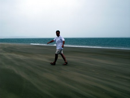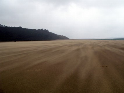 Am Morgen haben wir erst mal die örtliche Tourist Info aufgesucht. Wir hatten gehofft hier ein paar Anregungen zu finden, was man die nächsten Tage im Norden so treiben kann. Aber irgendwie haben wir da nichts interessantes gefunden. Es gab nur allgemeine Sachen über Northland aber nichts konkretes in Form von Tipps für Aktivitäten oder Tourvorschläge. Im "Blablabla-Cafe" eine Straße weiter haben wir erst mal den Frühstücks-Kaffee eingefahren. Wirklich toller Kaffee in riesigen Tassen ! Klasse. Dann haben wir uns dazu entschieden noch nicht direkt weiter die Küste hochzufahren sondern wieder runter und zwar zum Beginn des 108-KM-Fahr-Strand bei Pouto. Das nennt sich da unten Ripiro Beach. Dieser Strand ist für seinen sich schnell bewegenden Sand bekannt und dieser hat auch schon etliche alte Schiffsteile, Anker und Bugteile von versunkenen Wracks preisgegeben. Dort wollten wir uns mal umsehen. Da wussten wir aber noch nicht, das ca. 3/4 der Strecke ziemlich bescheidene Gravelroad waren. Irgendwann als die Strecke immer schlechter wurde wollten wir schon rumdrehen, haben es aber dann doch durchgestanden. Am Strand angekommen haben gaaanz kurz dran gedacht einfach drauf zu fahren. Wir haben uns aber mal den Sand angeschaut. Schon bei der Auffahrt lag soviel tiefer und lockerer Sand, das wir garantiert die Karre da versenkt hätten. Wir haben es dann nicht getan und sind stattdessen zu Fuß weiter. Die Wanderung war recht nett. Irgendwann nach ner ganzen Zeit konnte man auch die ersten dicken Baumstämme aus dem Sand ragen sehen und weiter am Horizont war auch noch mehr zu sehen. Aber da fing es plötzlich an zu regnen. Ein fieser Wind kam auf und hat uns von unten nassen Sand gegen die Beine und von oben nasses Wasser ins Gesicht geblasen. Wir haben auch sofort den Rückzug angetreten hatten, aber noch ein wirklich langes Stück zu laufen vor uns. Gegen Ende sind wir sogar wirklich gelaufen. Hat aber alles nix genützt. Als wir am Auto angekommen waren waren wir klitschenass und gesandstrahlt.