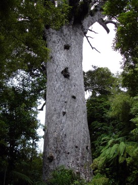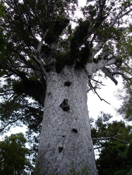 Wir haben uns so gut wie es nur irgend ging erst mal sauber gemacht und sind feucht und klamm die Rüttelstrecke zurück gefahren. Zum Glück blieb das Wetter hinter uns. So hatten wir jetzt dann doch zum eigentlich ersten Mal während der ganzen Zeit in Neuseeland wirklichen Regen erlebt. Schon auf dem Weg zurück zur Hauptstraße klarte es immer mehr auf und spätestens als wir uns auf der Hauptstraße wieder Richtung Norden befanden war wieder strahlender Sonnenschein. Zwei Sachen waren passiert. Wir hatten die Strecke unterschätzt und wir waren länger am Strand unterwegs wie geplant. So war die Uhrzeit auch schon weit fortgeschritten und wir mussten sehen, das wir zügig weiterkamen. Irgendwann als wir endlich wieder bei Dargaville auf der 12 nach Norden unterwegs waren haben wir erst mal Kilometer gefressen. Auf der Fahrt weiter die Küste entlang kommt man zuerst durch ziemlich viel flache und grüne Graslandschaft. Später ändert sich dies und es geht in sehr hügeliges Gelände über und man kommt durch die großen Kauriwälder. Hier steht auch der größte der Kauri-Bäume. Der Tane Mahuta. Ein Baum, dessen Stamm mal eben 6 Meter breit ist. Die genauen Daten habe ich jetzt nicht mehr, aber es ist einfach riesig. So wenig Zeit wir zwar hatten, da haben wir aber zumindest angehalten. Ist auch nur 5 Minuten Fußweg von der Hauptstraße weg. Es war also auch nicht wirklich ein Umweg. Die Fotos von diesem Baum können das Gewaltige ohne einen Bezugspunkt zum Maßstab überhaupt nicht wiedergeben. Normal müsste man da einen Menschen hinstellen und damit fotografieren, damit man die Dimensionen besser schätzen kann.