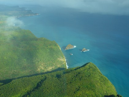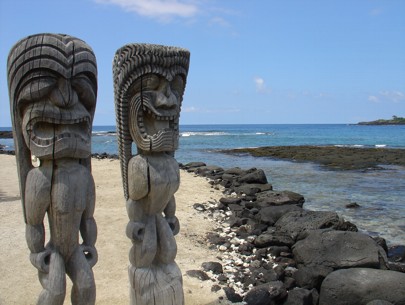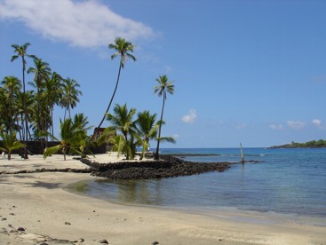 Wenn ich mich recht erinnere ging die ganze Sache ca. 90 Minuten. In dieser Zeit haben wir die Insel fast umrundet. Der Pilot hat zwar einmal abgekürzt um ein paar fetten Regenwolken auszuweichen aber ansonsten haben wir uns eigentlich fast immer an der Küste orientiert und ansonsten an den Vulkankratern. Der Flug war sehr schön und auf alle Fälle lohnenswerter wie ein Hubschrauberflug für das dreifache an Geld. Nach dem Flug hat jeder noch eine DVD mit Filmaufnahmen von der Flugroute bekommen. Da sind sogar richtige Lavaströme zu sehen. Irgendwie hatten wir für Lava den falschen Zeitpunkt erwischt. Als wir wieder auf dem Boden waren war es immer noch früh am Morgen, irgendwas um 10 Uhr. Also haben wir uns entschlossen heute mal mit unserem Autochen die Insel zu erkunden. Wir sind zurück nach Kona und dann immer an der Küste lang der Straße gefolgt. Wir haben an allen im Reiseführer beschriebenen Punkten mal vorbeigeschaut und dabei wirklich wunderbare Flecken entdeckt. Schöne Strände und außerhalb der Lavafelder noch viel Palmengrün. Auf unserem Weg haben wir unter anderem beim Place of Refuge gestoppt. Eine alte heilige Städte die sehr schön restauriert wurde. So gegen Mittag, als endlich alle Wolken über uns verdampft waren, wurde es wieder unerträglich heiß. Irgendwann konnte man es draußen nur noch im Schatten aushalten. Sobald man das Auto irgendwo 2 Minuten abgestellt hatte wurde man darin auch gegrillt. Also vom Wetter kann man sich hier nicht wirklich beklagen. Fast schon ein bisschen zu heiß.