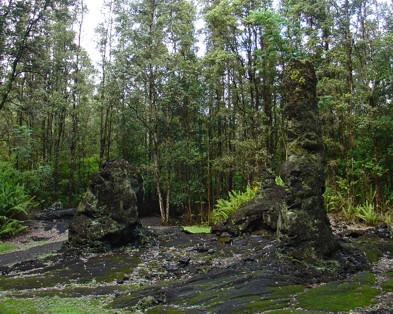 OK, so spektakulär war unsere Seite jetzt auch nicht, dafür waren hier keine Leute. In diesem Bereich der Straße haben sich nach dem Vulkanausbruch sogar wieder Leute angesiedelt. Kann mir vorstellen, das es sehr reizvoll ist in solch einer Lava Landschaft ein Häuschen zu haben. Auf dem Rückweg haben wir noch einen Schlenker gemacht und uns bei Kaniahiku das Lava Tree State Monument angesehen. Hier am A.... der Welt gibt es ein Waldgebiet (feinster Regenwald, wenn man aus dem Auto aussteigt wird man von der Feuchtigkeit in der Luft fast umgehauen) da stehen viele sog. Lavabäume. Hier ist irgendwann mal ein fetter Lavastrom durchgewälzt. Als die Lava die Bäume umspült hat und dadurch ein wenig erkaltet ist, ist die restliche Lava irgendwohin abgeflossen und hat diese Lavasäulen stehen gelassen. Diese Säulen sind hoch und dick wie ein Baumstamm und innendrin hohl, der Baum ist natürlich verbrannt. War schon recht bizarr anzuschauen. Irgendwie fragt man sich, was man mit Lava noch so alles anstellen kann. Da es jetzt schon unaufhaltsam dämmerte, mussten wir uns auch mal auf den Rückweg begeben. Wir hatten die Wahl den gleichen Weg zurückzufahren oder über Hilo zu fahren und unsere Inselumrundung komplett zu machen. Wir haben Nummer zwei genommen. Der Rest der Fahrt ist schnell abgehandelt. In völliger Dunkelheit und bei strömendem Regen (ab Hilo hatte es angefangen und sollte nicht mehr aufhören, bis wir endlich wieder die trockene Seite erreichten) war die Fahrt nicht sehr angenehm. Als wir schließlich über Waimea wieder nach Kona zurück kamen, war ich schon heilfroh endlich das Auto abstellen zu können. Aber wir hatten die Insel umrundet. OK, eine Hälfte im hellen und eine Hälfte im dunklen, aber immerhin :-)