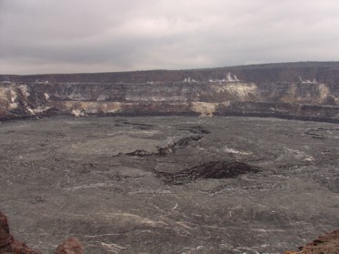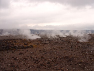 Noch einmal gut am King Ka - Buffet gefrühstückt und schnell ausgecheckt. Nächste Etappe ist der Volcanoes Nationalpark. Wir sind eigentlich die gleiche Strecke gefahren wie bei unserer Inselumrundung, natürlich haben wir uns die Abstecher gespart. Einmal haben wir noch am sog. Kau Desert Trail gestopt. Dort ist irgendwann mal eine Armee von King Kamehameha von einem Vulkanausbruch überrascht worden. Die fliehenden Krieger wurden vom heißen Ascheregen getötet und man soll noch die versteinerten Fußspuren sehen können. Was sich interessant anhört war in Wirklichkeit erschreckend unspektakulär. Nach längerem Marsch kommt man zu einer Überdachung, wo im Boden ein wenig Erde mit ein paar Mulden drin ist. Auf einer Schautafel wird dann erklärt, das sei der Grund, warum man hergekommen ist. Toll. Am Nationalpark angekommen sind wir sofort zum Hotel, dem Volcano House gefahren. Dort wollte man uns aber noch nicht reinlassen. Checkin erst am 15 Uhr. Egal. Um die Ecke im Visitor Center des Nationalpark haben wir erst mal Infos und Karten geholt. Dabei haben wir auch erfahren, das die Chance im Moment Lava zu sehen gegen Null geht. Jegliche Lava, die bisher im Park zu sehen war war seit ca. August nicht mehr zu sehen und keiner konnte vorhersagen, wann und wo wieder etwas zu sehen sein wird. Mit großer Zuversicht haben wir zwar noch regelmäßig die aktuellen "Eruption Updates" der Nationalparkverwaltung gelesen. Was aber auch nix gebracht hat. Ein wenig enttäuscht haben wir uns dann aber auf den Weg durch den Park gemacht. Man kann auf dem Crater Rim Drive eine schöne Rundfahrt durch den Park machen. Zahlreiche Abstecher links und rechts gehen noch zu schönen Aussichtspunkten ab. Angefangen bei den Sulphur Banks und den Steam Vents haben wir uns so einmal um den riesigen Krater herumgearbeitet. Die Steam Vents sind Erdspalten, aus denen dauernd heißer Dampf aufsteigt. Zusätzlich ist dies mit einem gurgelnden Fauchen unterlegt, so das man förmlich spürt, das dieser Dampf aus großer Tiefe kommt. Weiter auf dem Weg zum großen Kilauea Overlook fährt man durch zahlreiche Lavafelder, die alle mit Schildern datiert sind. So kommt man hier an einem "Lavaflow 1950" dort am "Lavaflow 1983" oder am "Lavaflow 1984" vorbei. Ich glaube 1984 war wirklich die letzte große Eruption mit großen Lavaflüssen. Bin mir aber nicht sicher.