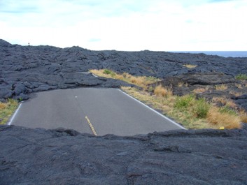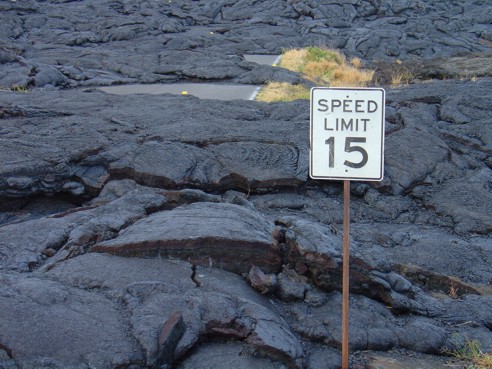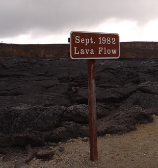 Wenn man einmal hier angekommen ist, liegt es sozusagen auf dem Weg auf die Chain Of Craters - Road zu fahren. Diese Straße führt von oben vom Kraterrand weit geschwungen bis hinunter zum Meeresufer. Auch hier fährt man eigentlich die ganze Zeit durch Lavalandschaft. Ein paar Aussichtspunkte links und rechts gibts auch hier. Unser Ziel war aber die Stelle der Straße, die durch einen Lavafluss unpassierbar geworden ist. Wir hatten ja schon die etwas unspektakuläre Rückseite gesehen. Jetzt wollten wir auch die schön präsentierte Schokoladenseite kennen lernen. Interessant ist, das gerade vor einem Jahr noch ein Lavafluss dort runtergekommen ist. In einer Nacht- und Nebelaktion musste die Rangerstation versetzt werden, da die Lava partout dort über Straße wollte :-) Seither ist ununterbrochen Lava ins Meer geflossen, was man aus der Ferne immer an riesigen Dampfwolken sehen konnte. Doch seit August ist auch hier Sense. Super. Nach obligatorischer "Besteigung" der "Straßenlava" und Besichtigung der angekokelten Verkehrsschilder, haben wir uns an der Rangerstation noch mit den Rangern unterhalten. Die hatten dort ein Fernglas aufgestellt, durch das man ganz klein einen glühenden Punkt entfernt an einem Berghang sehen konnte. Laut Angabe der Ranger die einzigste Stelle im Park die noch einigermaßen zugänglich war und den Ausblick auf Lava bietet. Obwohl es keinen ausgewiesenen Weg dort hoch gab und es auch nicht "recommended" war, wurde uns Mut gemacht dort hochzugehen. Da es aber schon auf den ersten Blick sehr weit und beschwerlich aussah, haben wir uns das erst noch genau durch den Kopf gehen lassen. Am Abend haben wir noch feudal im Volcano House gegessen. Essen war sehr gut aber nicht billig. Hatten wir von dem Laden dort aber auch nicht vermutet. Während des Essens haben wir uns übrigens noch dazu entschieden, morgen den Weg zur Lava doch zu machen. Wenn man nun einmal hier ist, dann will man auch Lava sehen.