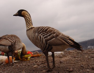 Am Kilauea Overlook kann man endlich die Riesenhaftigkeit dieses Vulkankraters überblicken. So weit das Auge reicht nur Vulkan, die sogenannte Caldera. Ein Teil dieses Kraters ist tiefer, dort gab es bis vor ein paar Jahrzehnten einen Lavasee. Ein wenig Rauch steigt immer noch überall auf. Wann es hier aber wieder richtig losgeht, kann keiner sagen. Fakt ist, die ganzen Bilder mit großen Lavafontänen sind alle etliche Jahre alt, im Moment ist sehr wenig bis keine Aktivität. Der nächste interessante Punkt ist der Halemaumau Overlook, eben dieser etwas tiefere Krater im Krater. Man kann von Parkplatz direkt drangehen. Hin und wieder ziehen schon mal ein paar Schwefelwölkchen vorbei und der faule Eier Geruch hängt immer ein wenig in der Luft. Laut Schautafel war dieser Krater 1924 noch 365 Meter tief und mit einem Lavasee gefüllt. Seit 1982 ist aber leider nichts mehr zu sehen. Die ganz Harten könnten von hier noch den Trail durch die komplette Caldera zurück zum Volcano House nehmen. Das haben wir aber gelassen. Am Kraterrand hatten Einheimische Opfergaben für die Vulkangöttin Pele gemacht. Die wurden aber schon mit Genuss von den einheimischen Nene-Gänsen verspeist. Weiter auf der Strecke nach diversen Lavafeldern und Overlooks beidseitig der Straße kommt man zum sog. Devastation Trail. Ein von einem Ausbruch total zerstörtes Gebiet. Nur noch ausgebleichte Baumstammgerippe zeugen davon, das hier mal ein kompletter Wald stand. Durch diese unfruchtbare Landschaft geht auch ein Pfad. Wir haben hier aber auf halbem Weg abgebrochen, das es zu regnen anfing und uns in kurzer Hose und TShirt doch zu kalt war.