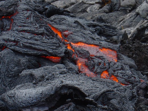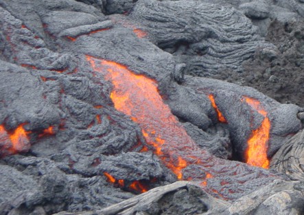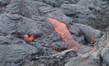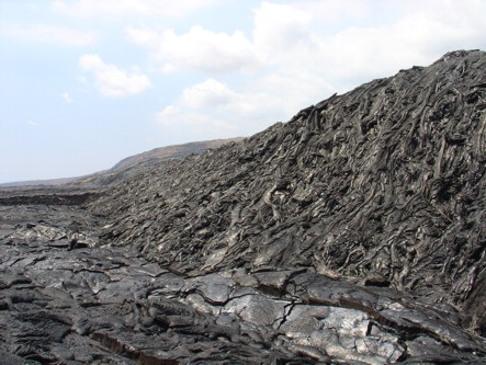 Das gehen auf der Lava ist wie das laufen auf Glas. Immer knistert und knackt es. Manchmal bricht man ein wenig ein. Klettern muss man nicht, der Fluss an sich ist recht eben. Teils halt nur ziemlich zerklüftet. Dort wo es sich aufgestaut hat kann man ja einfach drumrumgehen. Man sollte versuchen nichts anzufassen. Die Lavabrösel sind scharf wie Glassplitter und man verletzt sich schnell. Aus diesem Grund sollte man auch tunlichst vermeiden hinzufallen. Man würde sich übelst verletzen ! Wir hatten die grobe Route vor uns. Oben auf dem Hügel war ein kleines Wäldchen an dem man sich orientieren konnte. Wenn wir in der Nähe der Lava wären, würden wir das schon merken, meinten die Ranger. Später am Berg wurde es wirklich anstrengend. Zwischendurch sah es so aus, als wenn ne Bombe eingeschlagen hätte. Hin und wieder musste man so etwas wie kleine Lava-Wasserfälle überqueren. Da war die Lava in unendlich vielen Spitzen erstarrt. Hier musste man wirklich sehr auspassen. Für den Weg hoch haben wir 4 Stunden gebraucht. Irgendwann haben wir wirklich gemerkt, das wir angekommen waren. Es wurde ziemlich heiß (noch heißer als es eh schon war) und da war dieses Knacken. Überall um einen herum waren die Steine an knacken. So etwa, wie wenn man sein Auto nach langer Fahrt in die Garage stellt und dann der Motor am Tickern ist.